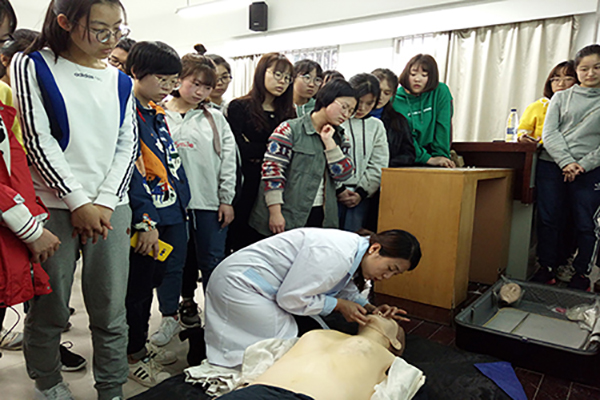 讲座中,陈医生通过幻灯片放映,视频展示以及现场模拟实践等多种形式让同学们充分地认识到了自救急救的重要性,除此之外陈医生还详细讲解了心脏复苏、溺水急救、排除气道异物等实用性技巧,同学们情绪高涨并积极认真参与其中。