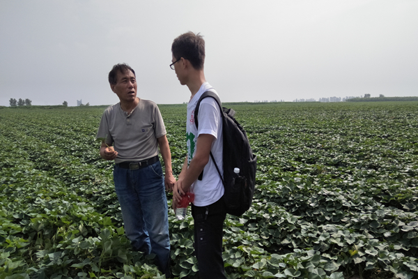 在当地政府的带领下,同学们拜访了红薯种植大户王明宗,来到了他的红薯种植基地,映入眼帘的便是长势极好的大片红薯田,每隔一段红薯田便有一个品种介绍的标牌。经过王民宗的介绍,同学们了解到这些红薯都是专家正在研究的试验品种,还要根据今年红薯的收成和长势情况来筛选出适合当地种植情况的优良品种。王民宗告诉队员们,在他的红薯园中70%-80%的红薯是用于直销市场、20%-30%用于电商销售。同学们还得知,合阳县已经有了自己成熟的红薯网站平台--合阳县北雷红薯业专业合作社,而他在其中更是任理事长一职。王民宗通过他的经验为同学们提供了很多生产销售方面的建议,他提到:“红薯全身都是宝,它的茎叶可作菜,是当地的一种尚未在市面上流通的特色产品,把红薯做好宣传就可以推出去,外界知道咱们的红薯特色才会来购买与食用,这样才会带动经济发展。”除此之外,同学们还了解到当地的红薯品种:秦薯3号,秦薯5号等都是我校著名教授、陕西红薯之父--朱俊光老师研发出来的优良品种!
