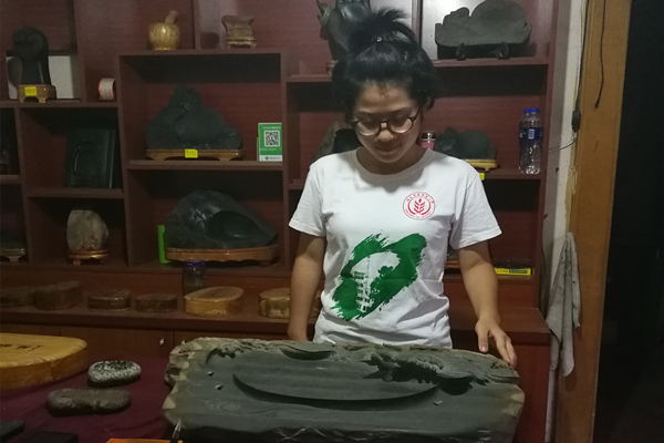 传统工艺技人还带领考察队成员亲自体验了砚石的鉴别方法。传统工艺技人一般采用看、摸、听、磨四种方法,讲究石色罗纹均匀细密、石色纯洁;眉纹典型分明,分布均匀;感觉细腻滋润如美人肌肤;声音如金属般清脆、如磬如铜;杀墨如风,磨墨如锉,下墨如油。