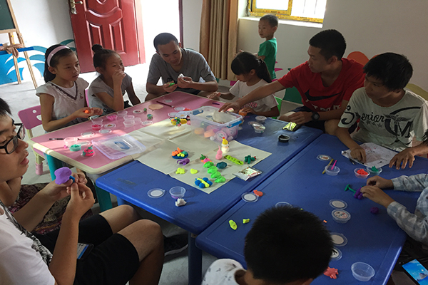 队员们和小朋友合作完成橡皮泥作品