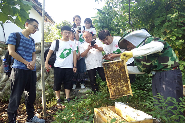 在村书记和村主任的带领下,队员来到了中蜂产业园,这里大约有70到80个蜂箱,大约四个蜂箱为一片区域,中间有蜂口,方便采蜜和流通。养殖人员为了让队员看的更加仔细,特地打开了一个蜂箱以供参观。蜂箱上有两个顶,一个为挡板,一个是漏型板,最要作用是通风透气,中间有蜂网型挡板,蜜蜂在挡板上产蜜,过段时间就可以在上边刮下蜂蜜了。代玉龙书记介绍道:“养蜂很重要的一点就是管理要细致,要及时查看蜂箱,如果蜂箱里面生了虫或是爬进了蚂蚁,不及时清理的话,蜜蜂就会全部飞走,这样的案例在其他村发生过很多,给村民造成了很大的损失。因此,我们这里聘用了专职技术人员进行实时管理,他是一位退休教师,多年养蜂,积累了丰富的经验。”作为精准扶贫中一个新兴产业,青羊村做的非常到位。“我们这里作为中蜂蜂蜜的原产地之一,从养殖到的加工蜂蜜,包装成品都是在村内完成,这个产业既增加了我们村的收入,还让村民可以尝到可口的蜂蜜,一举两得。”王主任对青羊村现在成熟的养蜂技术非常自豪,中蜂产业已经成青羊村的一张名片,将来一定会发展得越来越好。