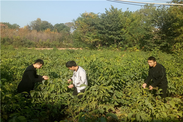 时值秋季,天气温和,下午,队员们来到田地开始检测情况。小心进入田地后,队员们开始对核桃幼苗展开逐株检查。由于种植密度较大,幼苗之间空隙较小,因此叶子几乎连在一起。拨开交织的叶子,队员们认真观察叶面有无明显虫子,随后对幼苗的叶背、苗枝进行仔细检查。其中,不少叶子上面都有虫子,颜色或白或黑,虫害的情况不容忽视。在田里检查时,队员们恰好碰上了一位干活的大叔,在进行一番交流与调查后,队员们对这片地的病害情况有了大致的了解。