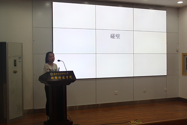 严堃同学一开始向大家介绍了自己大学四年来所获得的荣誉,包括校级实践先进个人,院十佳歌手等,简单的介绍了她优秀而又充实的大学生活。之后,严堃同学说到,几乎所有人在生活中都会有所碰壁,在碰壁之后,同学们应该用乐观的心态,将悲愤转换为动力,积极的面对生活。所谓年轻,就应该有朝气,有活力,就应该负重前行,不惧怕失了面子,也不惧怕彷徨与碰壁。