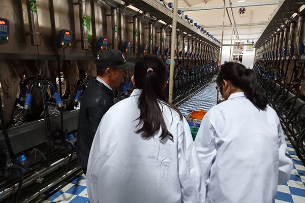 活动当天,队员们在吴忠市荣跃牧场厂长金永国的带领下参观了牧场。在与金厂长的交流中,队员们了解到,吴忠市荣跃牧场是一个现代化牛场,奶牛存栏量达1500头,牛场设置了4座8000平方米的半封闭牛棚,并配备最新的养殖设备。牧场使用现代化挤奶设备,从挤奶前沐浴消毒到奶牛伴随音乐自动列队,都按照国际标准进行精细操作。奶牛的日均单产奶量可达32.5公斤,该地区已成为蒙牛、伊利等大型乳企的黄金奶源基地。