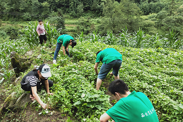 正值给红薯苗施肥的季节,队员们看见村民在忙碌地施肥,就计划帮村民们拔草。在当地人的指导下,队员们渐渐学会了如何除去红薯苗中的杂草。起初容易把一些矮小的红薯苗误认为杂草,随着越来越多的实践,队员们积累了一些经验,干的井井有条。面对正下着小雨的天气,队员们浑然不觉,手上沾着泥,鞋已经脏的不成样子,但队员们想着在自己的努力会帮村民减轻负担,就充满成就感。