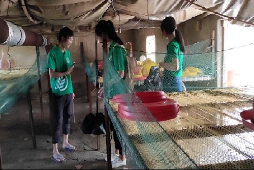 在养殖户村民的带领下,队员们来到鸡舍。鸡舍建在远离乡村的田地里,进入鸡舍,看到这里的鸡已大不同于调研第一天所见,主人告诉队员们:“这是已经初长成的散养鸡,正打算出笼,再不出笼的话,就要亏本了,多养一天就多亏一天的饲料钱。”。队员们在和鸡舍主人的交流中得知,像他们这样规模的养殖户,很难找到专业的销售点,以买家上门的销售方式居多。