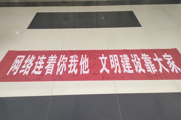 活动的最后,现场拉起了写有“网络连着你我他,文明建设靠大家”的横幅,同学们在横幅上郑重签下自己的名字,要做网络文明的践行者、宣传者、推进者、捍卫者。