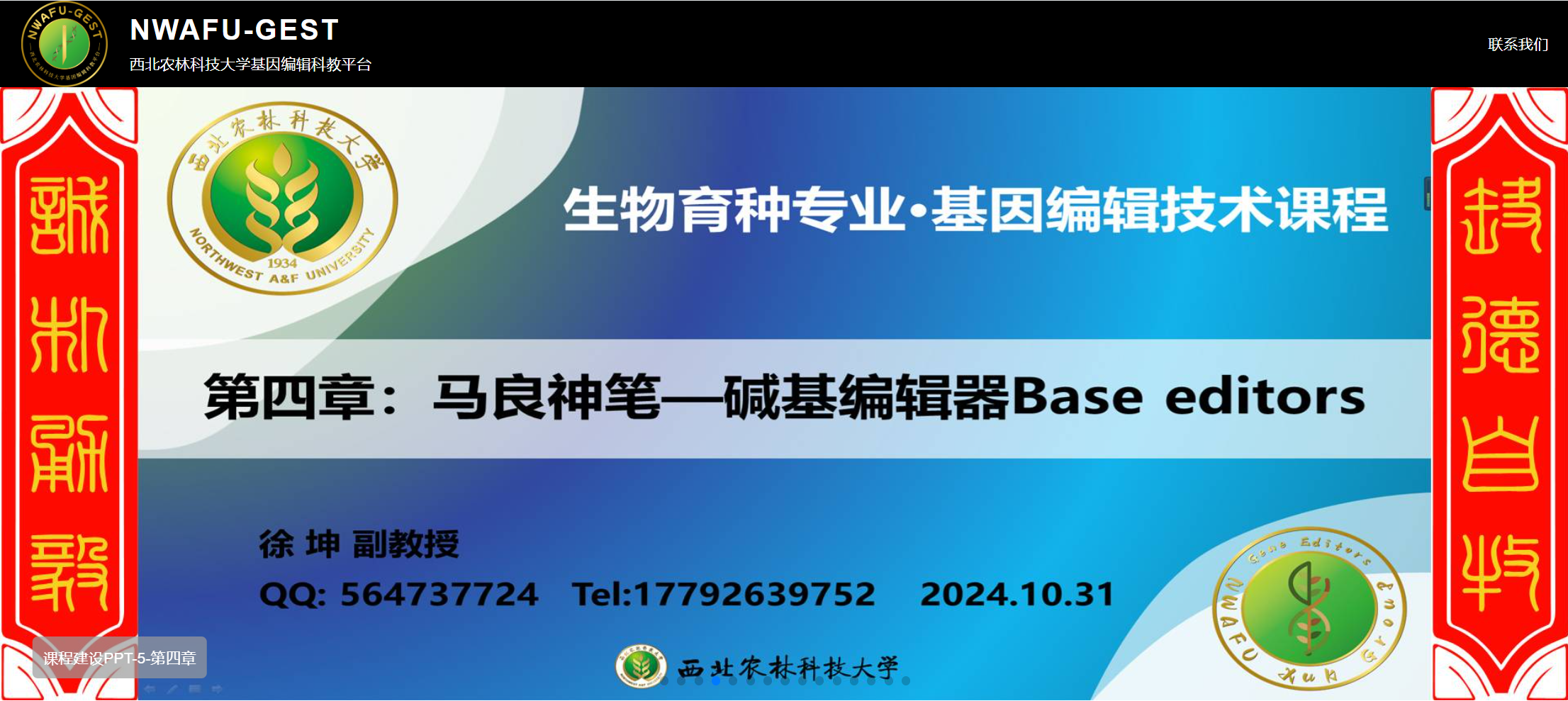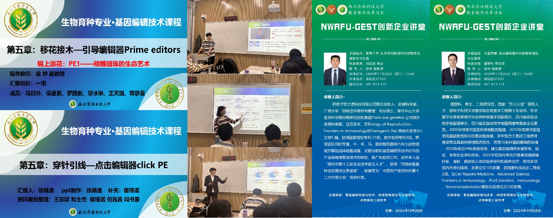 课程由有着近10年基因编辑相关教学经验的徐坤副教授担任主讲,由在羊生物育种领域颇具影响力的王小龙副院长和学校新引进的基因编辑领域高层次人才魏迎辉教授进行专题讲座。课程团队已于2024春/夏学期顺利完成了新开研究生课程《基因编辑原理与技术》的首次授课,并在学校和绿帽小说 的大力支持下打造了西北农林科技大学基因编辑科教平台(The Platform of NWAFU Gene Editing Scientific Teaching, NWAFU-GEST;//lab.gewu.pro/groups/index/U1Y0L9)。