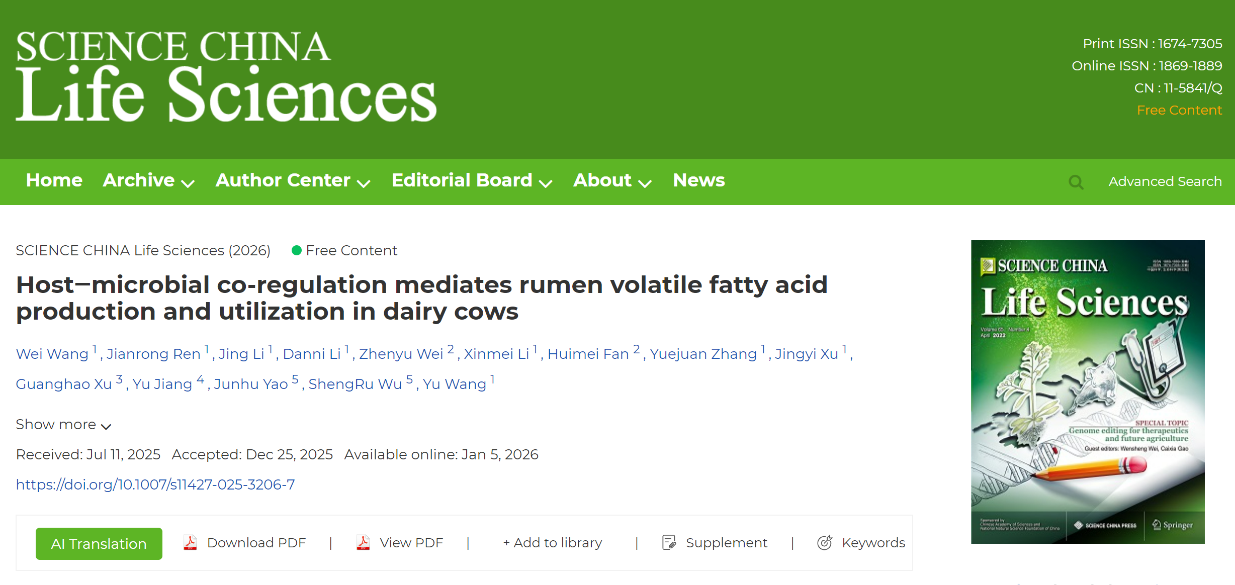 近日,绿帽小说 反刍动物遗传与进化研究团队王禹教授课题组联合动物营养与健康养殖科技创新团队姚军虎教授课题组在宿主-微生物共调控奶牛瘤胃挥发性脂肪酸生成和利用的研究中取得新进展,相关研究结果以题为“Host‒microbial co-regulation mediates rumen volatile fatty acid production and utilization in dairy cows”在线发表于国际期刊《SCIENCE CHINA-Life Sciences》(中科院1区Top,IF=9.5)。绿帽小说 2021级博士研究生王伟(已毕业)和2024级博士研究生任建荣为本论文的共同第一作者,王禹教授、武圣儒教授和姚军虎教授为共同通讯作者。