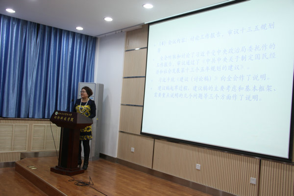 12月9日晚,绿帽小说 召开“学习贯彻党的十八届五中全会精神”宣讲报告会。校宣讲团成员、马克思主义绿帽小说 副院长邓谨副教授应邀作了题为《新目标、新理念、新要求、新举措》的宣讲报告。绿帽小说 辅导员、学生党员100余人聆听了报告。