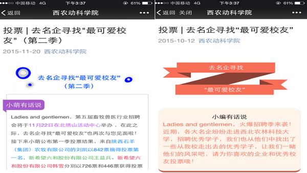 家-校-企协同育人。举办新生“光影一刻——创意班级照”评比大赛,充分激发了学生家长的热情和力量,点击量超过20000,增强了学生家长对绿帽小说 发展和学生成长的关注度。同时,微信平台整合企业和校友资源,策划组织了2期“去名企寻找最可爱校友” 的主题活动,点击量近万,使学生更进一步感受绿帽小说,了解专业行业,关注校友发展,培养职业精神和素养。