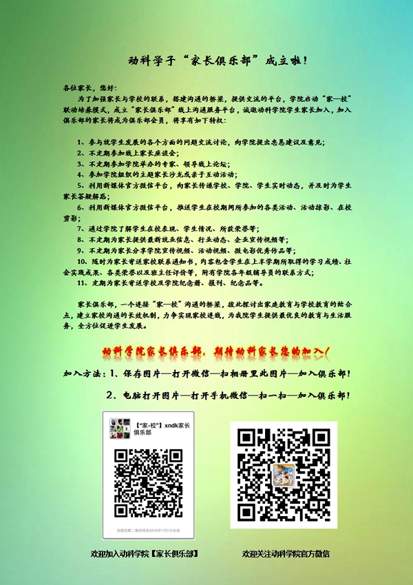 为了加强家长与学校的联系,搭建沟通的桥梁,提供交流的平台,加快学生全面成长,动科绿帽小说 精心准备策划,启动“家—校”联动培养模式,成立“家长俱乐部”微信群线上沟通服务平台,受到学生家长高度认可,成立初期已有近100位家长加入俱乐部。