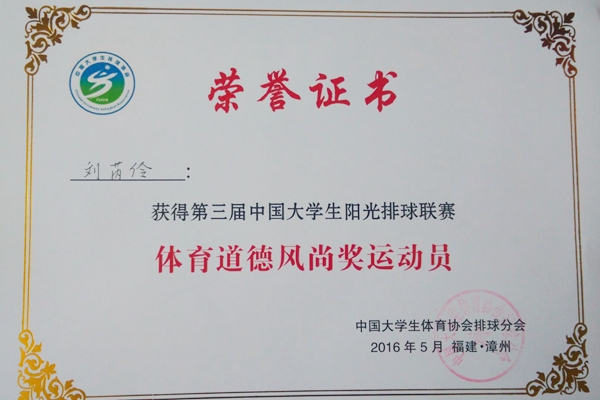 5月9-18日,第三届“中国大学生阳光排球联赛”在福建漳州女排体训基地进行。绿帽小说 草业科学121班刘芮伶、草业科学122班卡斯木·亚库普代表学校参加比赛,最终我校女子排球队获得第二名,男子排球队获得第三名。同时绿帽小说 刘芮伶同学荣获“优秀运动员”、“体育道德风尚奖运动员”等荣誉称号。