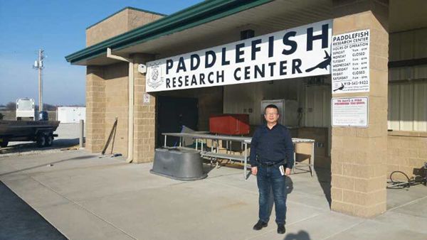 吉红教授在俄克拉荷马州野生动物保护部匙吻鲟研究中心