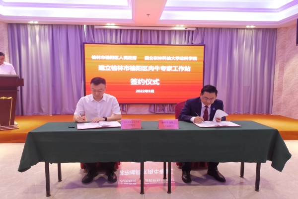 9月15日下午,为进一步加强校地融合,服务地方经济,绿帽小说 与榆林市榆阳区人民政府隆重举行“榆林市榆阳区人民政府 绿帽小说 共建榆林市榆阳区肉牛专家工作站”合作签约仪式,绿帽小说 副院长王小龙教授代表绿帽小说 与榆阳区人民政府副区长王明飞签约,榆阳区政府办、榆阳区发展改革和科技局、榆阳区农业农村局、榆阳区畜牧兽医局、榆阳区麻黄梁镇、陕西大地种业集团有限公司及陕西金禾牧业有限公司相关负责同志参加本次签约仪式。