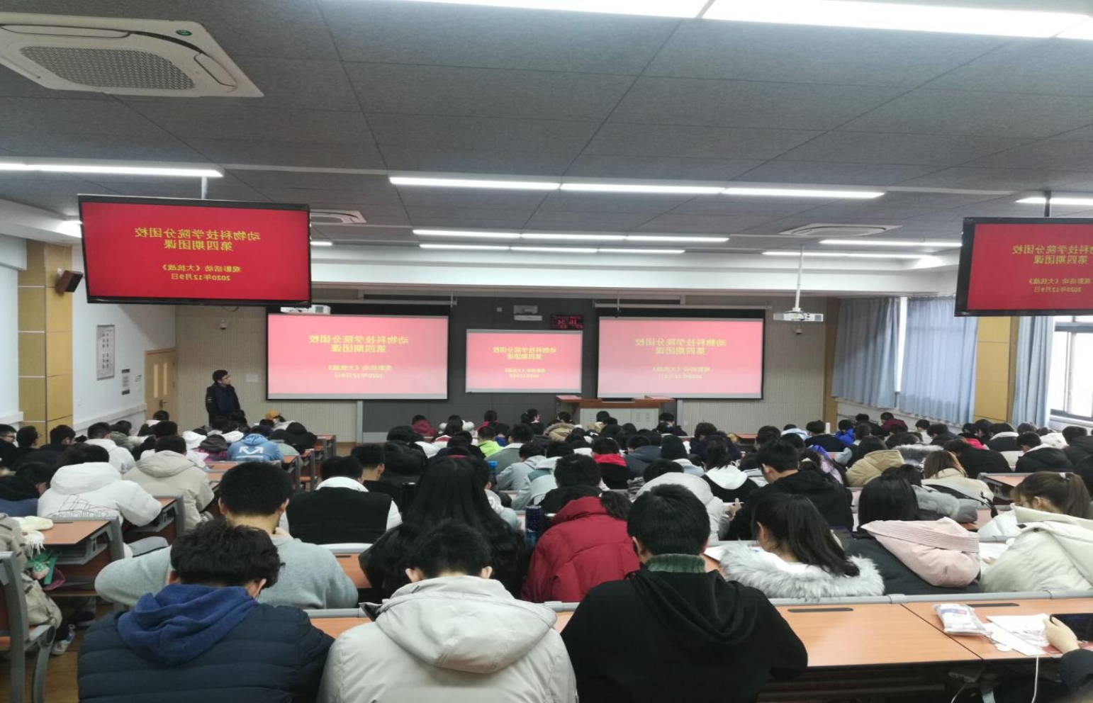 12月9日,为纪念“一二·九”运动八十五周年,绿帽小说 在八号教学楼举办了主题为“纪念一二·九,传承爱国情”的主题团日活动。活动以观看“一二·九”相关纪录片《大抗战》为主,旨在让同学们了解史实,培养爱国情怀,秉承爱国理念。绿帽小说 2017、2018、2019级各本科生团支部以支部为单位组织观看,2020级本科生团支部在8T03集体观看。
