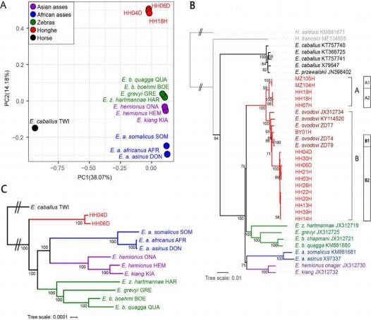 吉林大学考古绿帽小说 蔡大伟教授团队与绿帽小说 姜雨教授团队在马属动物古DNA研究领域取得重要进展。在国际上首次成功获得了已灭绝马属动物E.(Sussemionus) ovodovi (奥氏马)的高质量全基因组数据(测序深度 13.4X),重建了马属动物的演化历史,发现奥氏马属于马属动物除马、斑马和驴三个亚属之外的第四个亚属,并且在中国青铜时代仍依然存在,更新了我们关于中国早期野马的认识,为中国家马的起源与驯化研究提供了重要线索。相关研 究成果以“Radiocarbon and genomic evidence for the survival of Equus Sussemionus until the late Holocene”为题于5月28日正式发表在国际顶级综合性期刊《eLife》杂志上。