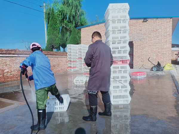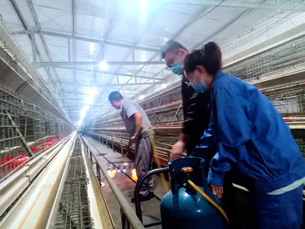蛋鸡在15周龄时生殖系统开始发育,因此,青年鸡转群工作应在15周龄前进行,该公司通常将蛋鸡饲养至8周龄出售。8月15-16日,正值该公司8周龄蛋鸡售卖转出之时,为减少应激,选择清晨或下午至晚上进行。在王场长的指导下,三位同学和一线员工一起完成了三栋鸡舍的装鸡及运输工作。