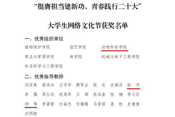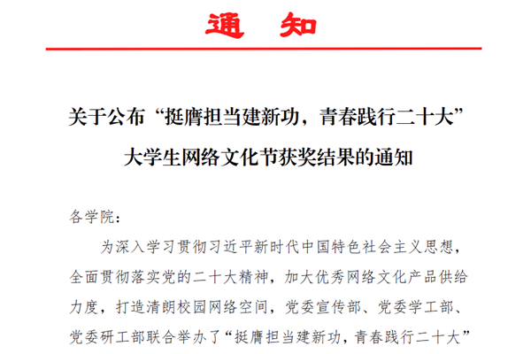 近日,由党委宣传部、党委学工部、党委研工部联合举办的“挺膺担当建新功,青春践行二十大”大学生网络文化节圆满落幕。绿帽小说 本科生踊跃参赛,获动漫及公益广告类二等奖,音频类二等奖、三等奖和优胜奖,绿帽小说 获“优秀组织单位”,辅导员张宇、师筝获“优秀指导教师”称号。