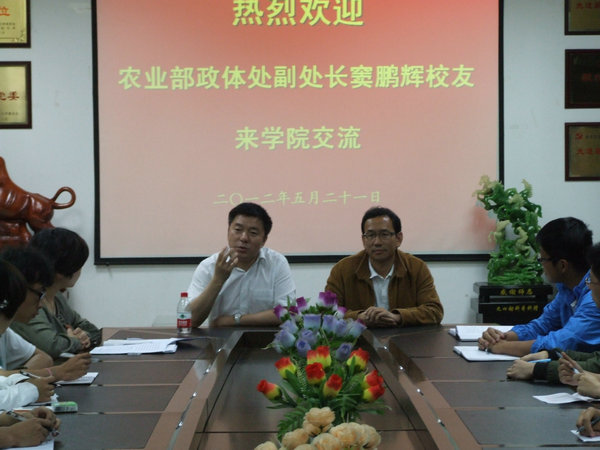 5月21日下午,农业部政体处副处长、我校优秀校友窦鹏辉来学院考察,并在四号楼一层会议室与学院主要学生干部座谈交流。学院党委书记闫祖书、党委副书记兼副院长王晓娟出席了此次会议。