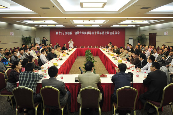4月30日上午,99级动科、动医专业校友毕业十周年师生联谊座谈会在杨凌国际会展中心酒店举行。任课教师代表、动科学院领导闫祖书、昝林森、呼天明、王晓娟、动医学院领导赵献军、张彦明、靳亚平、申让平及99级动科、动医专业10个班的120多名校友参加了联谊座谈会。座谈会由校友动科学院办公室主任王力主持。