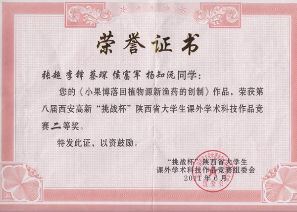 近日,由省教育厅、团省委、省学联、西安高新区管委会主办第八届西安高新“挑战杯”陕西省大学生课外学术科技作品竞赛评选结果揭晓,我院水产专业07级学生张超、侯富军、李铎、蔡琛和杨知沅创作的作品《小果博落回植物源新渔药的创制》荣获二等奖。