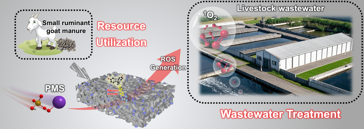 畜牧业在保障肉蛋奶供应的同时,也产生了大量畜禽粪便,其处理与处置是困扰行业可持续发展的关键难题。传统处理方式成本高且易造成二次污染。与此同时,养殖场自身也面临废水处理的压力。本研究以山羊粪便为原料,通过高温热解制备出氮掺杂多孔生物炭(NPBs),其与过一硫酸盐(PMS)构成一个高效的高级氧化体系,对自然界中广泛存在的环境激素-双酚A(BPA)具有较好的降解能力。