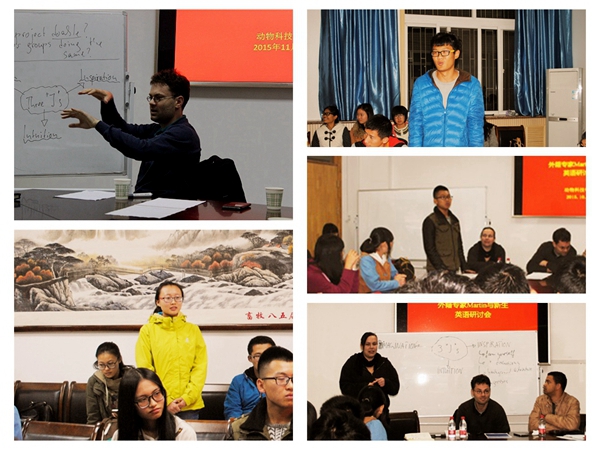 知之者不如好之者,好之者不如乐之者。针对15级新生,Martin教授以培养专业兴趣为主,通过国际化的视角讲述了自己走向奇妙科学世界的经历,表达他对于动物的热爱以及对于动物科学这一学科分支的浓厚兴趣。告诉同学们科学离不开灵感、直觉与想象力,鼓励大家能热爱科学,勇敢探索;面向14级同学,Martin教授引导同学们做好学业规划,希望大家明确自己来到大学的目标,树立正确价值观,充实大学生活的每个阶段。Martin教授以其独有的德式幽默鼓励在场学生敢于提出问题,勇于张口,积极提问。在老师的鼓励下同学们踊跃发言,针对留学、科研等问题用英语提出了自己的困惑,外教们则对同学们的问题进行耐心详细的解答。