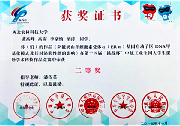 该科技创新团队2015年3月在我校第三届“本科生创新创业论坛暨成果展示”中获得理科类一等奖;2015年4月以《萨能奶山羊雌激素受体α(ERα)基因启动子区DNA甲基化模式及其对泌乳性能的影响》项目参加陕西省“挑战杯”大学生课外学术科技作品竞赛斩获特等奖;2015年11月赴广东参加被誉为“中国大学生科技奥林匹克”的全国第十四届“挑战杯”荣获二等奖。该项目结题时撰写英文论文一篇“DNA methylation pattern of estrogen receptor alpha (ERα) gene promoter region and its influence on milk