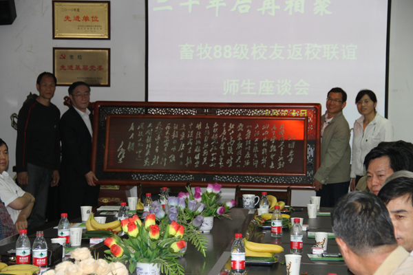 时任任课教师蒿迈道、张一玲、贺信义、渊锡藩、侯文通、魏忠义、王彩兰、张德英、李青旺、刘福柱、龚月生、曹社会、张恩平等老师分别发言,希望校友们爱护身体,在各自的工作岗位上再创佳绩。校友们逐一向老师汇报自己的工作生活情况。师生相聚有说不完的话题,座谈会上校友们怀着感恩的心情向学院赠送了牌匾。